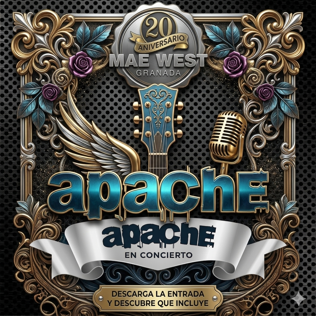 Prepárate para vivir una noche única con Apache en la mítica sala Mae West Granada. Con esta entrada digital, podrás disfrutar del directo arrollador del grupo en un entorno espectacular, con el sonido, la energía y la puesta en escena que caracterizan cada uno de sus conciertos.
